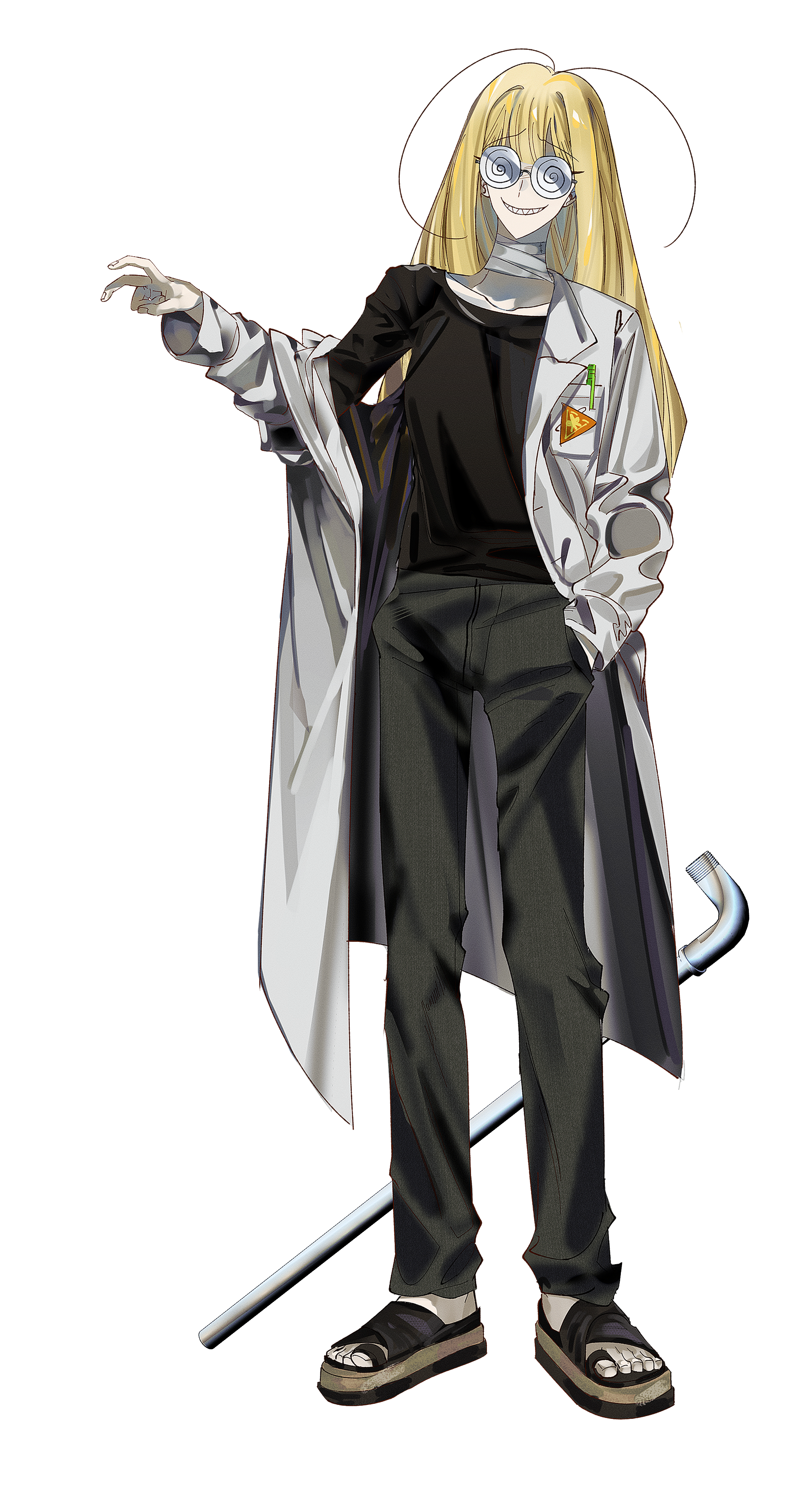 밝은 금발, 빙글 안경과 더듬이 한쌍.